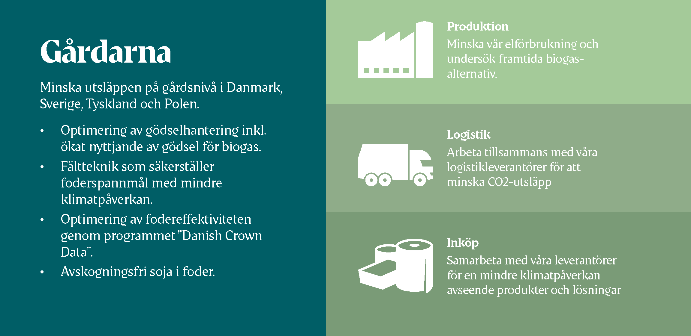 Hållbarhet handlar om vår framtida hälsa, om att ta ansvar för våra framtida generationer. Tillsammans med vårt moderföretag Danish Crown har vi lovat att ta på oss ledartröjan när det gäller att producera kött på ett grönare, mer hållbart och långsiktigt sätt. År 2030 ska Danish Crown vara en av världens mest hållbara köttproducenter.