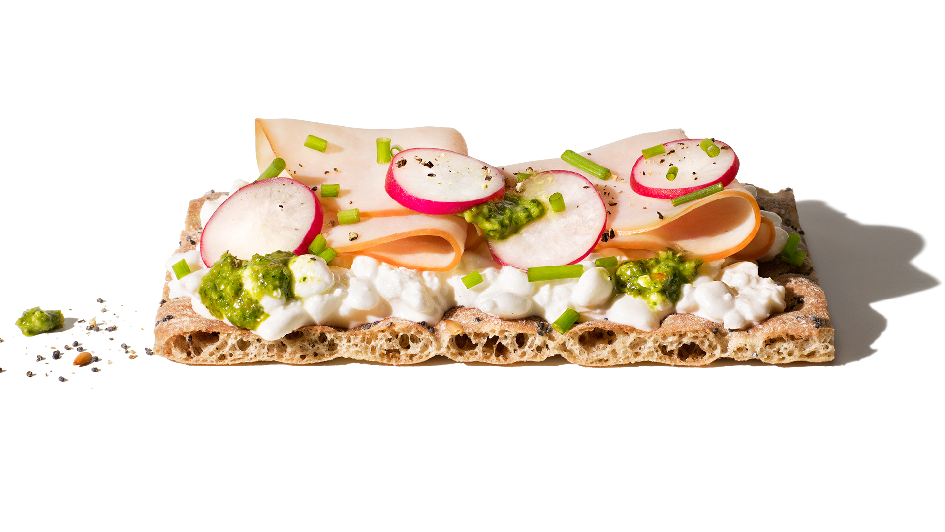 Keso, tunna skivor kyckling, rädisor, gräslök och pesto