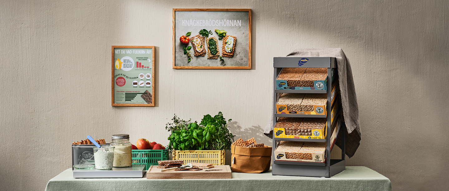 Om du vill få till en mer välordnad och inspirerande knäckebrödshörna som på bilden nedan kan du höra av dig till din Wasa säljare. Vi har flera olika ställ, brödburkar, korgar, fullkornsplansch, ”Knäckebrödshörnan”-plansch och goda recept på röror och spreads. Allt detta hittar du på Wasas hemsida.