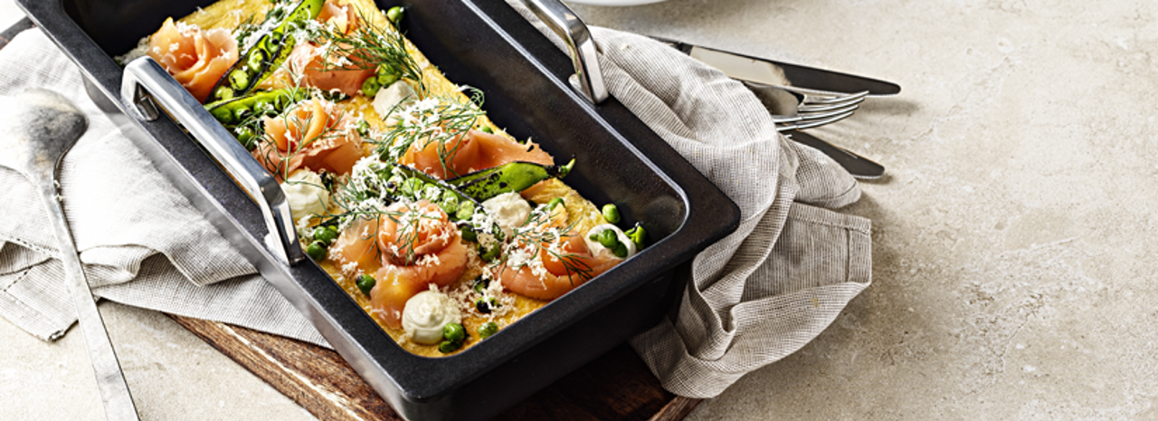 Snabbakad ägglåda med kallrökt lax, sotad spritärta,