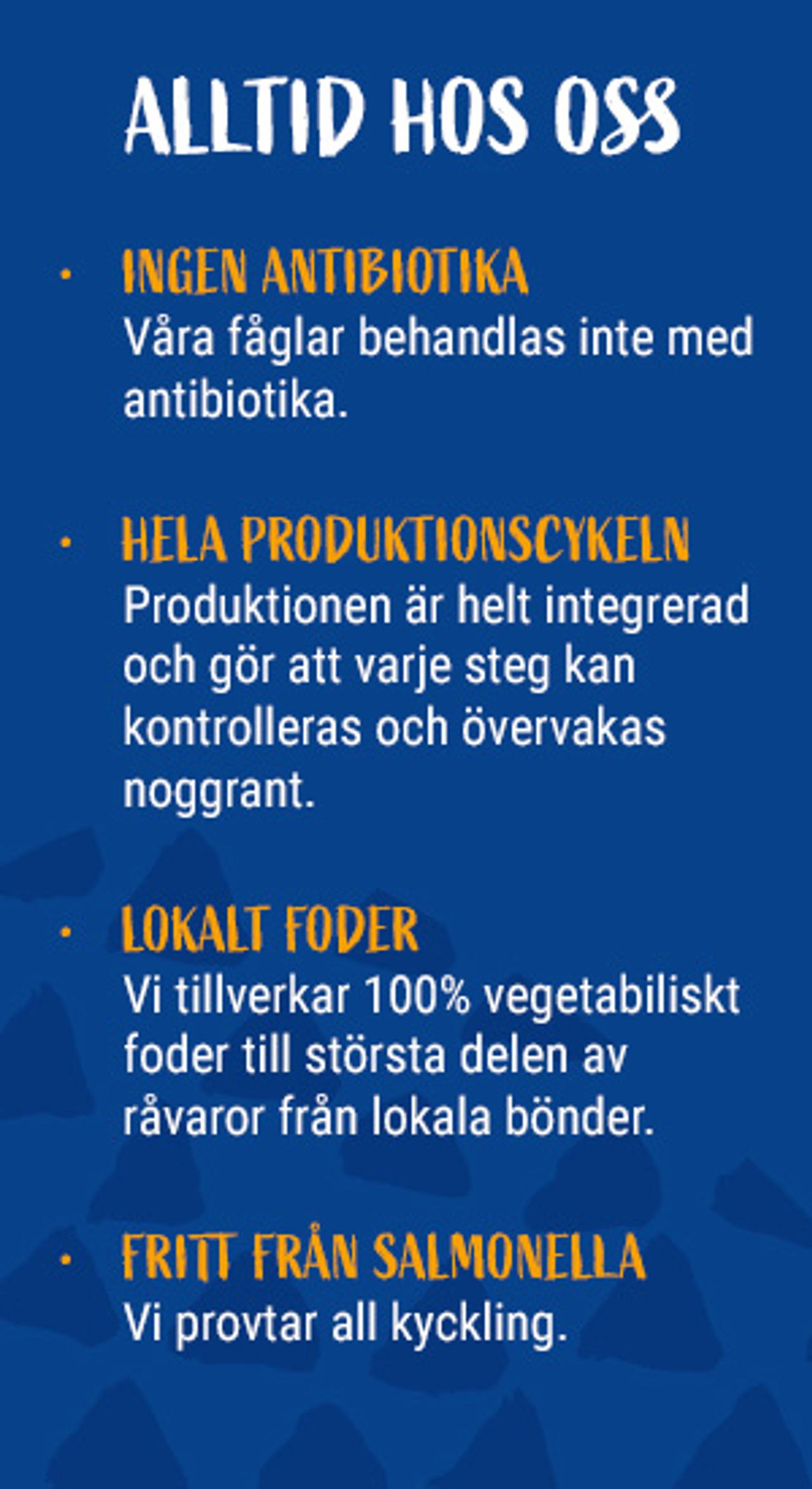 1) Utan antibiotika: Våra fåglar föds upp friska – helt utan rutinmässig användning av antibiotika.