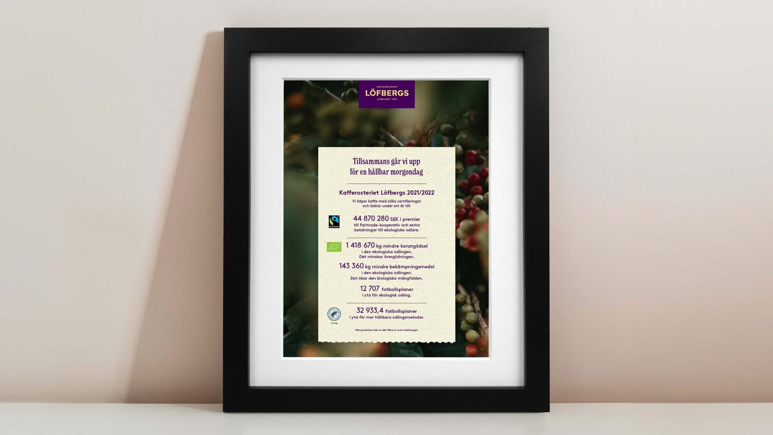 Serverar du certifierat kaffe? Då kan vi hjälpa dig att visa de positiva och konkreta effekterna som ditt val innebär. Med ett inramat hållbarhetskvitto på väggen talar du enkelt och tydligt om vad du är med och bidrar till.