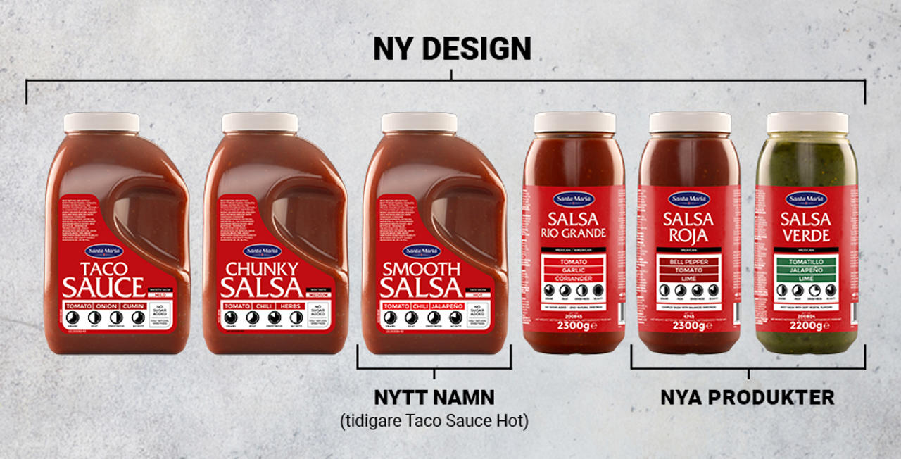 Det nya salsasortimentet bjuder på flera nyheter av olika slag. Alla produkter har fått en ny design som tydligt presenterar varje smakprofil. Salsan som tidigare hette Taco Sauce Hot tillverkas fortfarande enligt samma recept men har bytt namn till Smooth Salsa. Och de gamla favoriterna har fått sällskap av två helt nya produkter: Salsa Roja som är en tomatsalsa med röd paprika, komplex smak och fin balans mellan sött och syrligt. Salsa Verde som är en tomatillosalsa med frisk syra från lime och behaglig hetta från jalapeños.