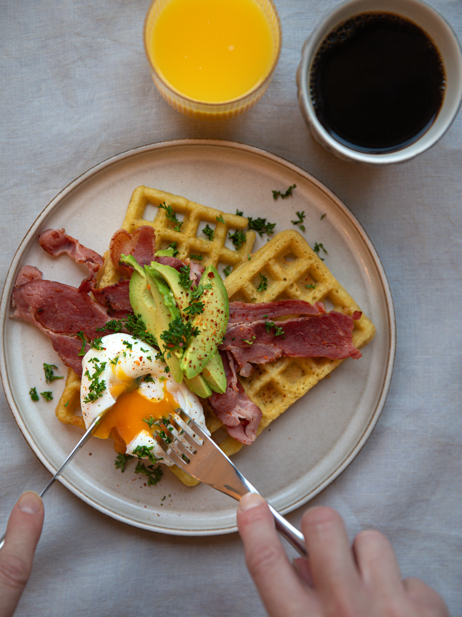 Frukostvåffla: Avokado, pocherat ägg och bacon