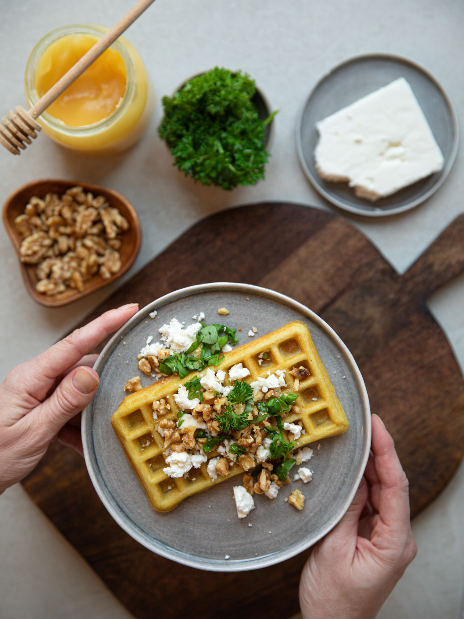En våffla kan även bli en lyxig förrätt. Tänk dig en krispig våffla toppad med smulad getost, generöst ringlad honung och grovhackade valnötter. Tillsammans skapar de en perfekt balans mellan sött, salt och nötigt.