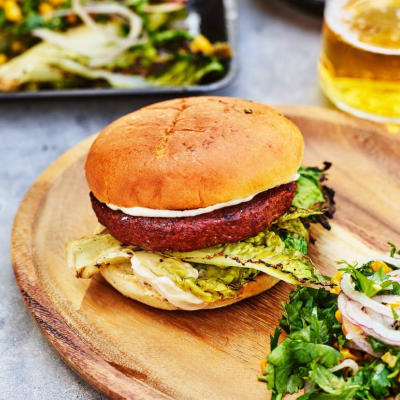 Veganburgare med majs och jalapeñosrelish, grillad hjärtsallad samt syrlig rökt majonnäs