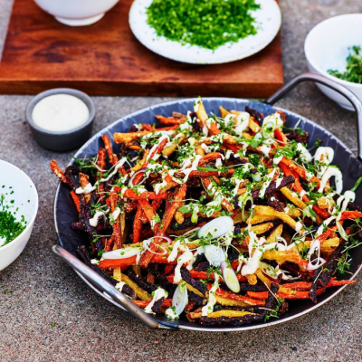 Veggie fries är en spännande variant till klassiska fries. En mix av morot, rödbeta och palsternacka som vi kryddat upp med en blandning på shihimi, rökt paprika och rostade fänkålsfrön.