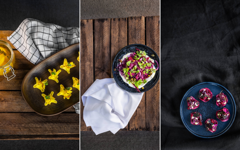 ”Ett perfekt snacks som verkligen triggar smaklökarna! Små knyten av picklade, gula betor som jag fyllt med fluffig ricottakräm smaksatt med salt, espelettepeppar och citronzest. För att få riktigt tunna och snygga skivor hyvlar jag betorna i en mandolin och stansar sedan ut dem. Resterna vänder jag upp i maizena och friterar för att sen använda som topping. Betorna får dra i lagen under minst två dagar. I just denna lag har jag valt att använda flädervinäger som syra. Prova gärna att byta ut den klassiska ättikan mot andra smaksatta vinägrar. Våga laborera med nya smaker och testa dig fram för att hitta nya smakkombinationer. Vid servering låter jag de inlagda betorna torka lätt på lite papper innan jag spritsar ut den fluffiga ricottakrämen. Avslutningsvis formar jag betorna till en liten blomma som jag toppar med de friterade betorna.”