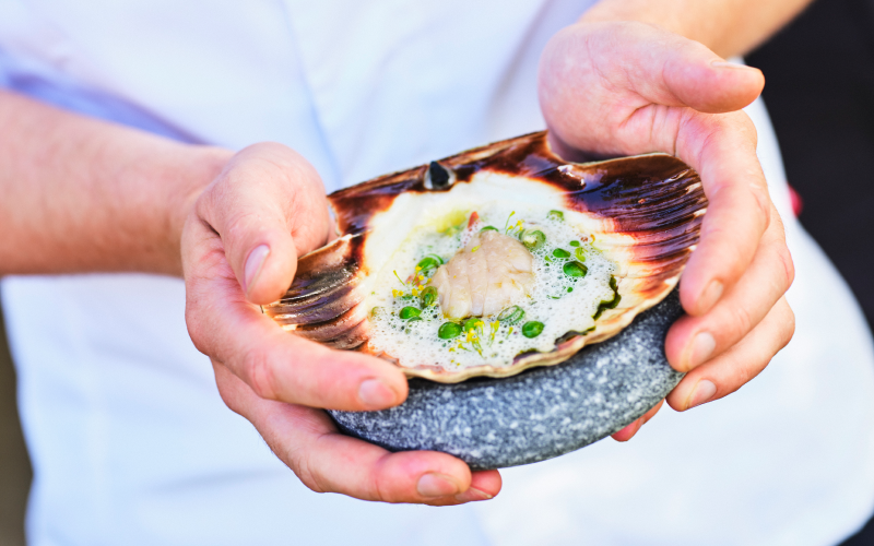 – Jag gillar pilgrimsmusslor, gärna serverade i sitt vackra skal. Färska pilgrimsmusslor har fantastiska kjolar som många kanske slänger, men de är otroligt smakrika och passar utmärkt att koka buljong på. Även romsäcken har väldigt god smak och ger en fin färg i rätten.