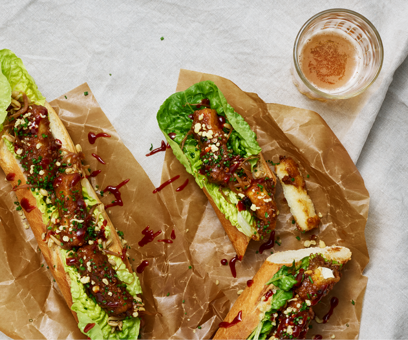 Bahn mi med friterad tofu och sojafärs smaksatt med sichuan-chili