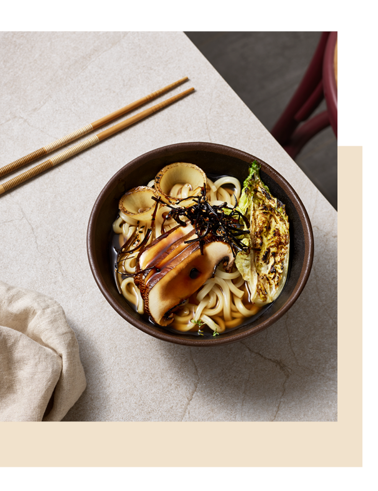 Värm nudlarna i saltat vatten och fördela i nudelboxar eller skålar. Slå över varm buljong och addera svamp, ugnsbakad lök och sotad hjärtsallat. Avsluta med taresås som ripplas över för smak och toppa med en konbusallad.